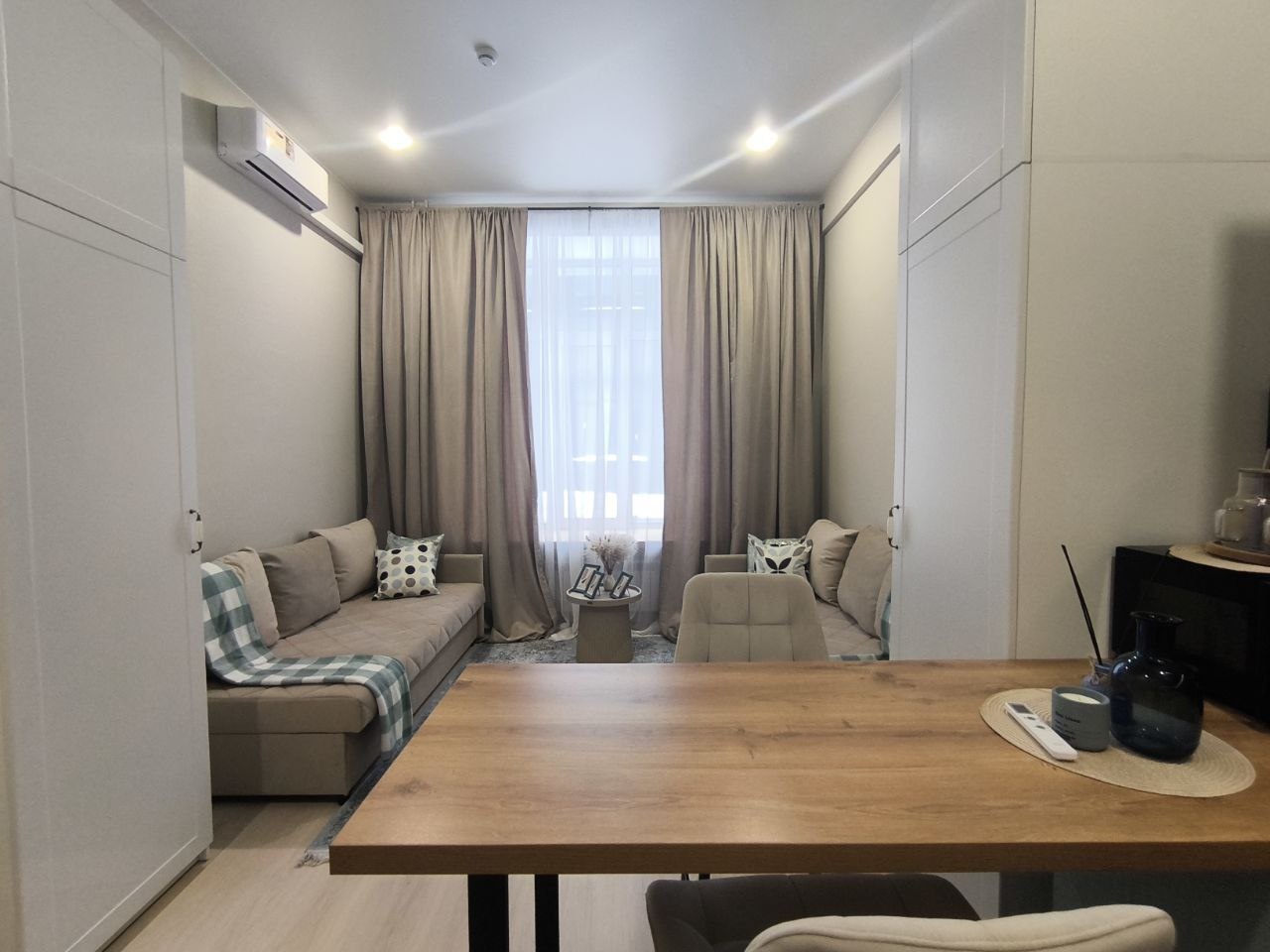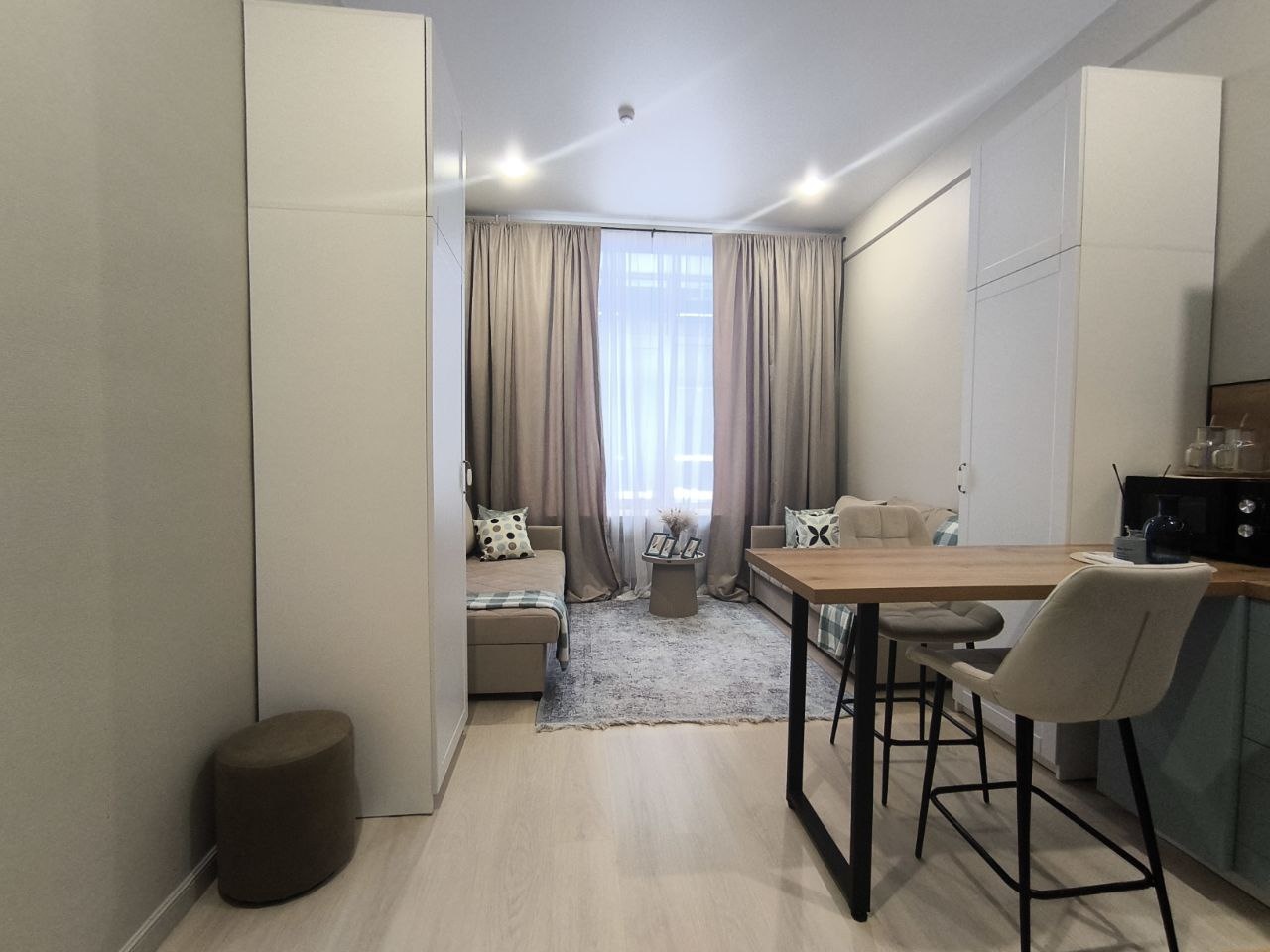 • Простор и свет: функциональная планировка площадью 23.2 м² с большими окнами, включая изысканные арочные конструкции — здесь всегда будет много естественного света.
